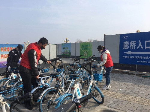 志愿者協(xié)助保安對(duì)廊橋引橋主口、西口的共享單車(chē)進(jìn)行規(guī)范擺放
