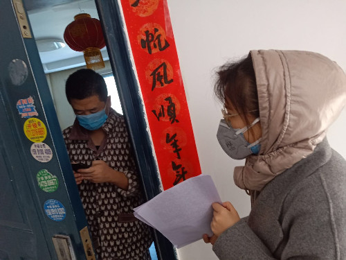 志愿者配合小區(qū)物業(yè)上門(mén)完成業(yè)主信息填報(bào)工作