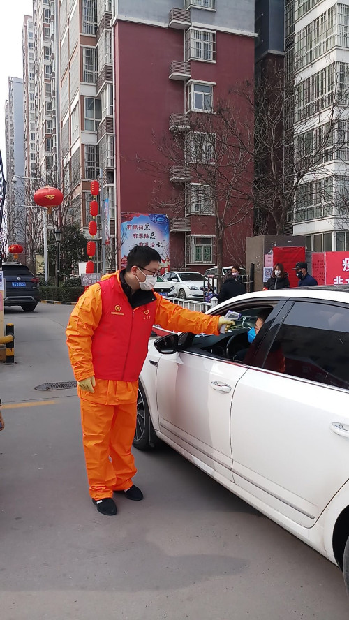 志愿者對(duì)進(jìn)入小區(qū)車(chē)輛上的司乘人員進(jìn)行測(cè)溫