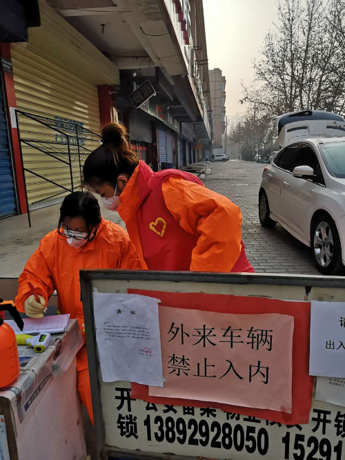 志愿者協(xié)助小區(qū)做好出入口人員測(cè)溫、信息登記工作
