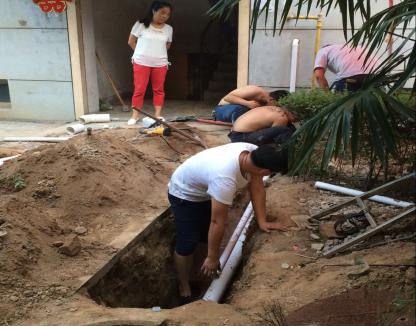 得知情況后,小區(qū)維修組立刻組織人員前往現(xiàn)場,根據(jù)踏勘,分析為地下管網(wǎng)問題,需要開挖進一步確定?梢驑乔皡^(qū)域狹小,不便使用機械,只能人力開挖。